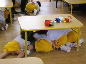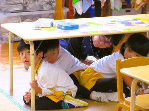 「地震です。地震です。幼稚園のお友だちは先生の言うことをよく聞いて机の下に隠れましょう。」