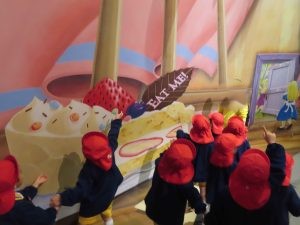 トリックアートの大きなケーキ・・・自分が小さくなったみたいだね・・・。