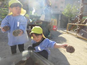 大きい松ぼっくりを使ってケーキ作りも楽しいです・・・。