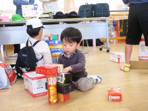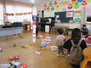 空き箱を積み上げて遊ぶ「はこつみつみこーなー」も人気です・・・。