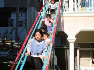 2階からの避難滑り台も使って避難訓練です・・・。