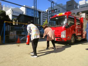 先生方も消火訓練・・・先生 がんばれー・・・