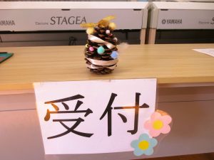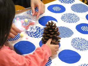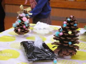 親子で松ぼっくりのクリスマスツリーを作ります・・・。