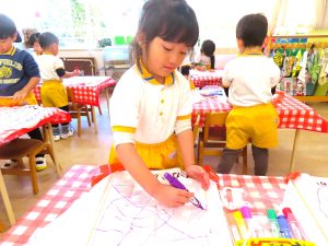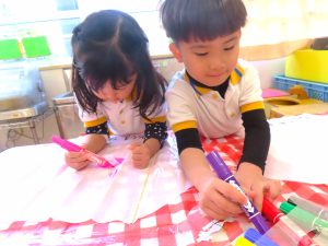 たこあげ大会の前に、先ずは自分のたこにいっぱいデザインを書き込みます・・・。